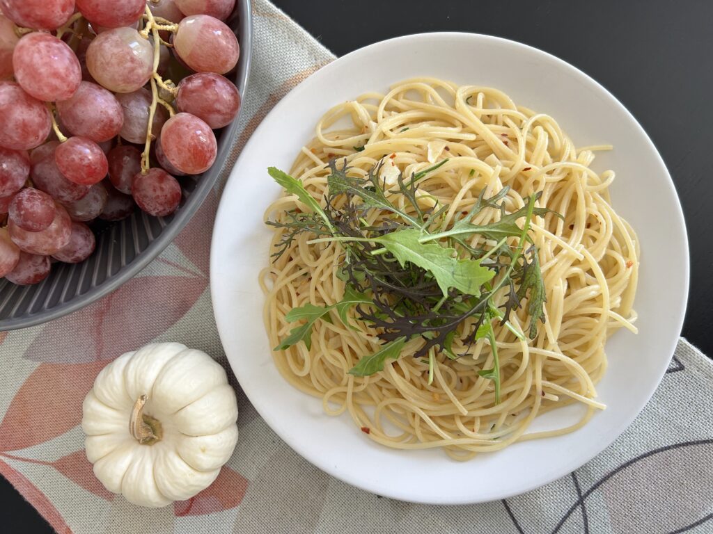 Aglio e olio spagetti friss rukkolával Ez az a fajta étel, ami bizonyítja, hogy nem kell túlgondolni semmit: pár alapanyag, jó minőségű olívaolaj, fokhagyma, egy csipet chili – és