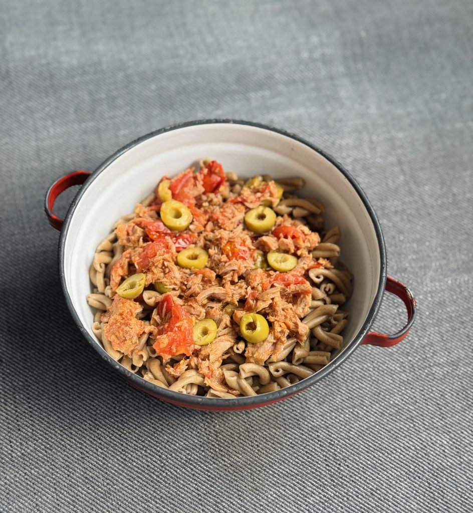 Egyszerű tonhalas-olívás tészta Ez az egyik kedvenc gyors megoldásom, amikor tesómnál vagyok – nála a zöldségkínálat általában kimerül a paradicsomban, a kamrában pedig mindig van tészta meg egy-két tonhalkonzerv. Így